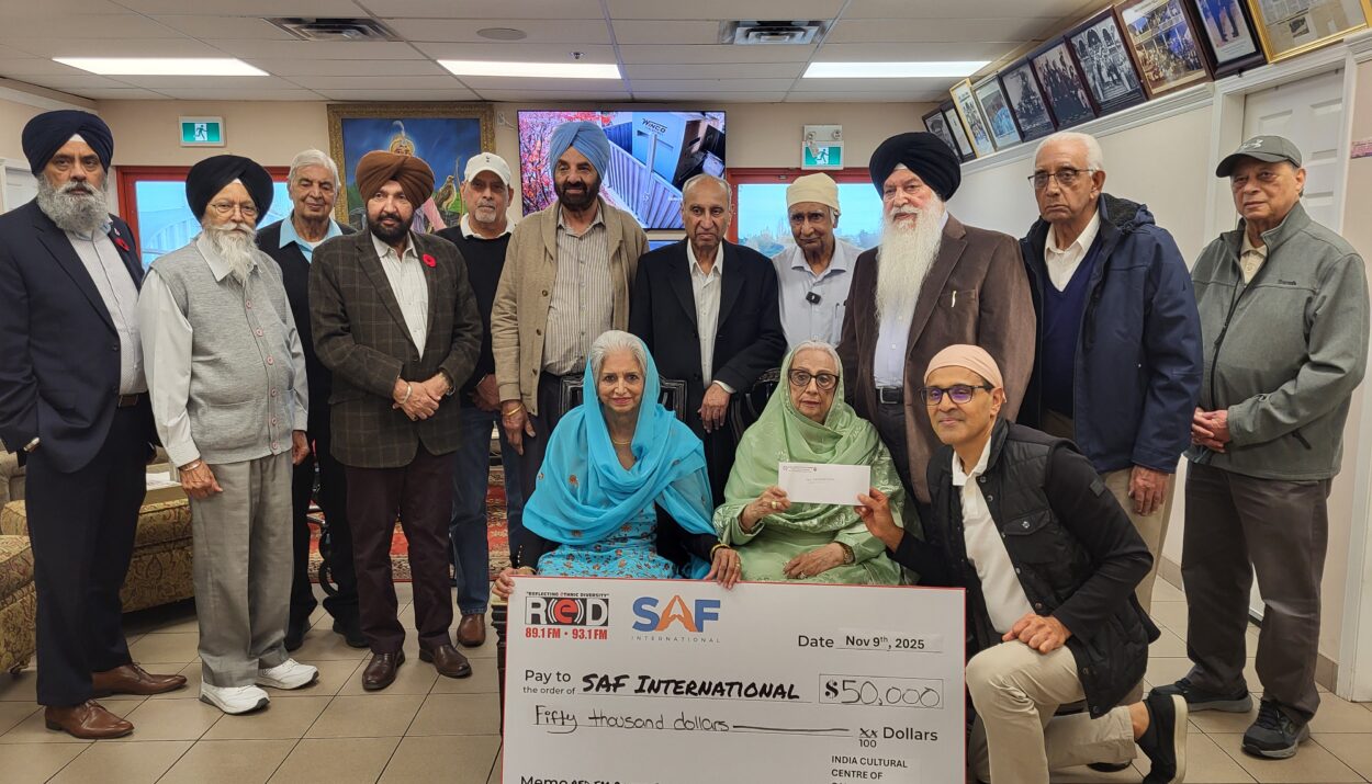 Millions of dollars have already been raised by radio thons and other fundraisers to help the needy in the Punjab. At India Cultural Centre of Canada Gurdawra Nanak Niwas, 8600 #5 Road in Richmond, BC, the management committee, with the help of the Sangat, has raised $50,000 to help the needy in the Punjab. A cheque for $50,000 made out to Sikhi Awareness Foundation International (SAF International ) was handed over by Gurdwara Society’s Chairperson Kashmir Kaur Johal to radio RedFM CEO Kulwinder Singh Sanghera on Sunday, November 9 at the Gurdwara .