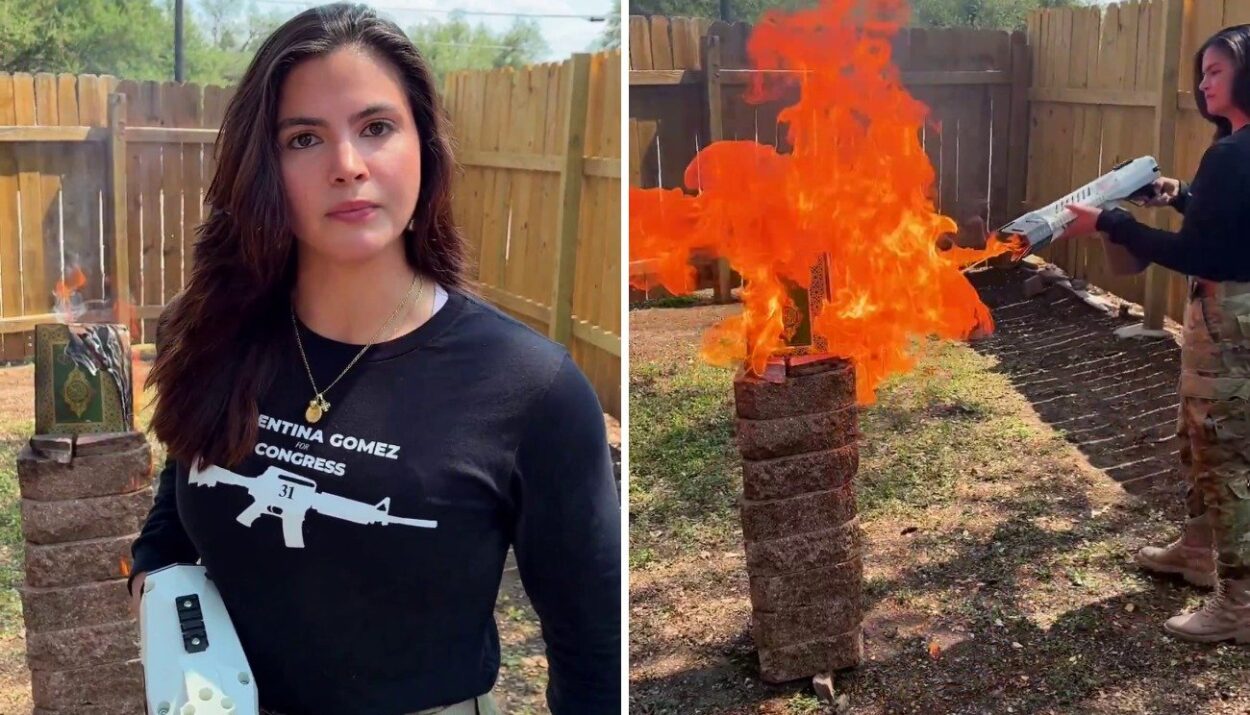 MAGA idiot and Trump supporter Valentina Gomez filmed herself burning a Quran with a flamethrower. She started the video by saying, “Your daughters will be raped and your sons beheaded, unless we stop Islam once and for all,” and then proceeded to set the Quran on fire. She concluded the video, saying, “powered by Jesus Christ.”